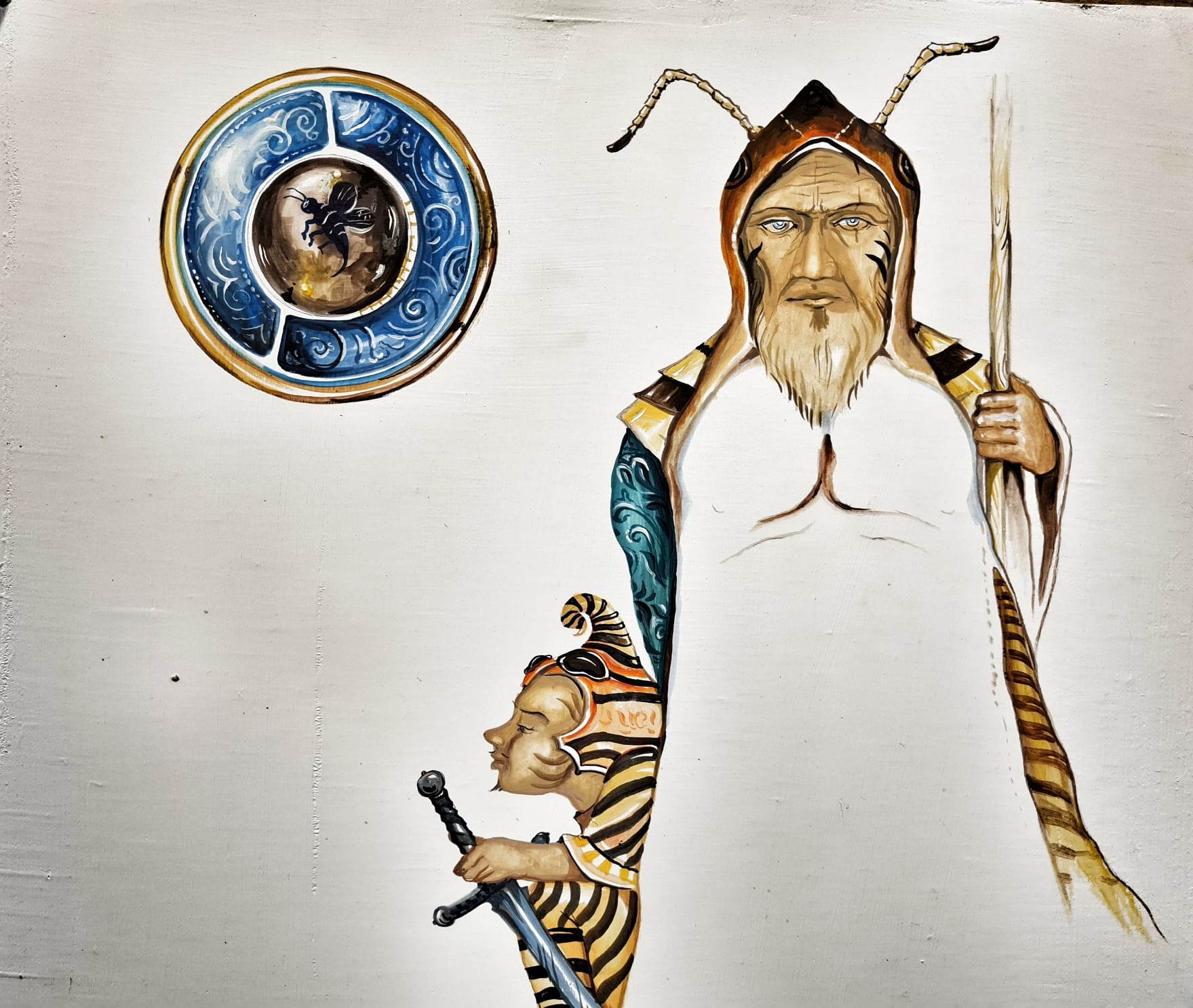 „(…) Am mers pe pigmenți naturali, am lucrat cu pensula, cu acul am zgâriat detalii, dar cea mai mare problemă nu a fost suportul – pe ce să lucrez -, ci cum să arate albina asta: să fie cu față de copil, cu față de albină, sunt sute de povești cu albine… așa că am mers pe o combinație mai curajoasă unde albina are o față între animal și om, dar în același timp are blană pe ea. Am încercat să dau o tentă dulceagă, dar și mai dârză. I-am dat și un tovarăș să nu meargă singură pentru că se zice că și se plânge rău singur, și se călătorește mai bine în pereche. (…) Poate am lucrat o lună în loc de o săptămână, dar mie mi-a făcut plăcere, m-am închis în casa veche să nu ies din minte. E foarte important tot timpul când avem un proiect să ne putem retrage la o parte, să putem să ne concentrăm pe povestea, pe lecția sau pe ce avem de făcut. Mi se pare o moștenire minimală. Atât trebuie să ținem minte.”, a spus Attila Bajko.