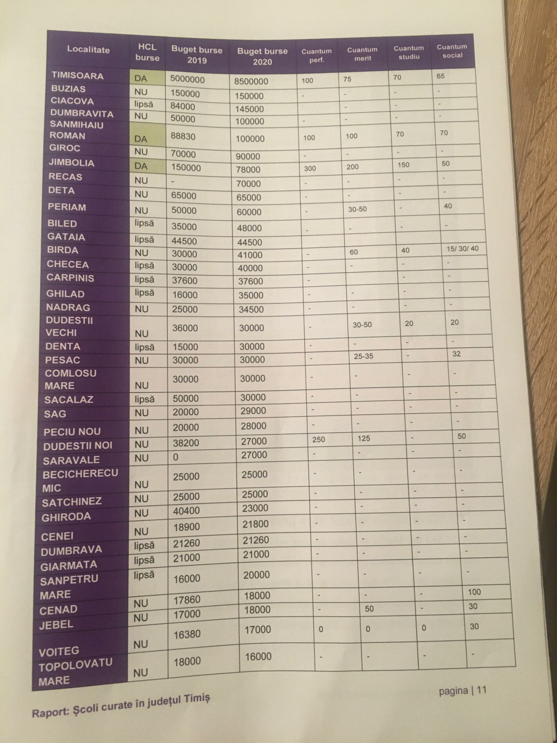 Peste 30 de primării din Timiș nu au alocat niciun leu de la bugetul local pentru burse, anul trecut, potrivit raportului. Alte 60 de primării nu respectă legea burselor, iar peste 20 de primării nu oferă informații despre hotărârile de consiliu local cu privire la banii investiți în școli.