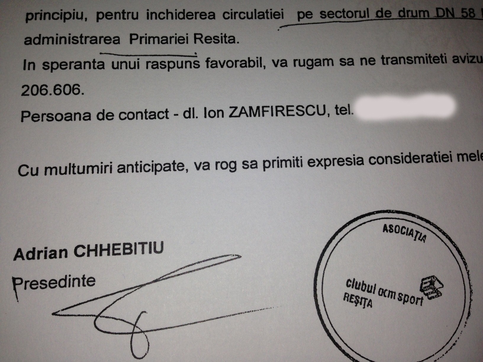 Președintele ACM Sport, Adrian Chebuțiu, a cerut sprijinul Consiliului Local pentru organizarea Cupei Reșița la automobilism, competiție înscrisă în Campionatul Național de Viteză în Coastă. Până aici, toate bune și frumoase! Într-una dintre adresele pe care le-a direcționat către Primăria Reșița, în sensul încheierii parteneriatului cu forul local, la final o dă cu bățul în baltă, întrucât hârtia pare fi semnată de un alt personaj. „Cu mulțumiri anticipate, vă rog să primiți expresia considerației mele, Adrian CHHEBITIU”, se arată în documentul înregistrat cu numărul 15 din 23.05.2013.