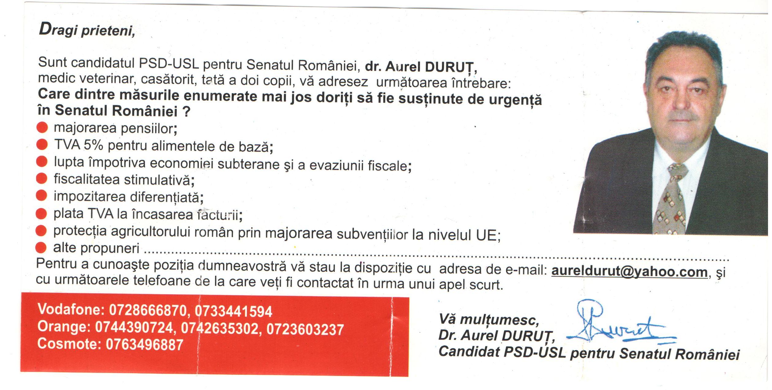 Cu toate acestea, medicul Aurel Duruț explică faptul că nu aceasta a fost intenția lui. „Este doar o întrebare pe care o adresez cetățenilor. Vreau să văd cu ce îi pot ajuta în cazul în care ajung în Parlamentul României. Fluturașul nu are însemne electorale pe el. Oamenii mă pot contacta, în cazul în care au de adăugat ceva la problemele pe care le-am sesizat eu”, a declarat candidatul USL . Acesta a adăugat că înainte să ia decizia de a trimite fluturașii în tot județul s-a consultat cu specialiști, care i-au confirmat faptul că materialul său nu poate fi interpretabil. „Atunci când încep campania electorală, voi tipări flyere cu însemnul USL pe ele și mă voi întâlni cu oamenii, ca să le ascult problemele pe care le au”, a subliniat medicul.