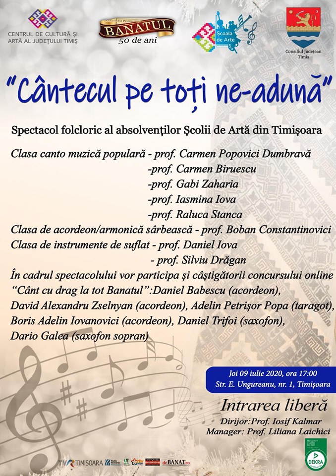 Joi, 9 iulie, tot de la ora 17.00, are loc un concert muzical specific tradițional bănățean al absolvenților claselor de canto muzică populară, acordeon și instrumente de suflat, intitulat „Cântecul pe toți ne-adună”. La acest eveniment vor participa cu o piesă folclorică și câștigătorii concursului online „Cânt cu drag la tot Banatul”. Acompaniamentul va fi asigurat de Orchestra Școlii de Artă.