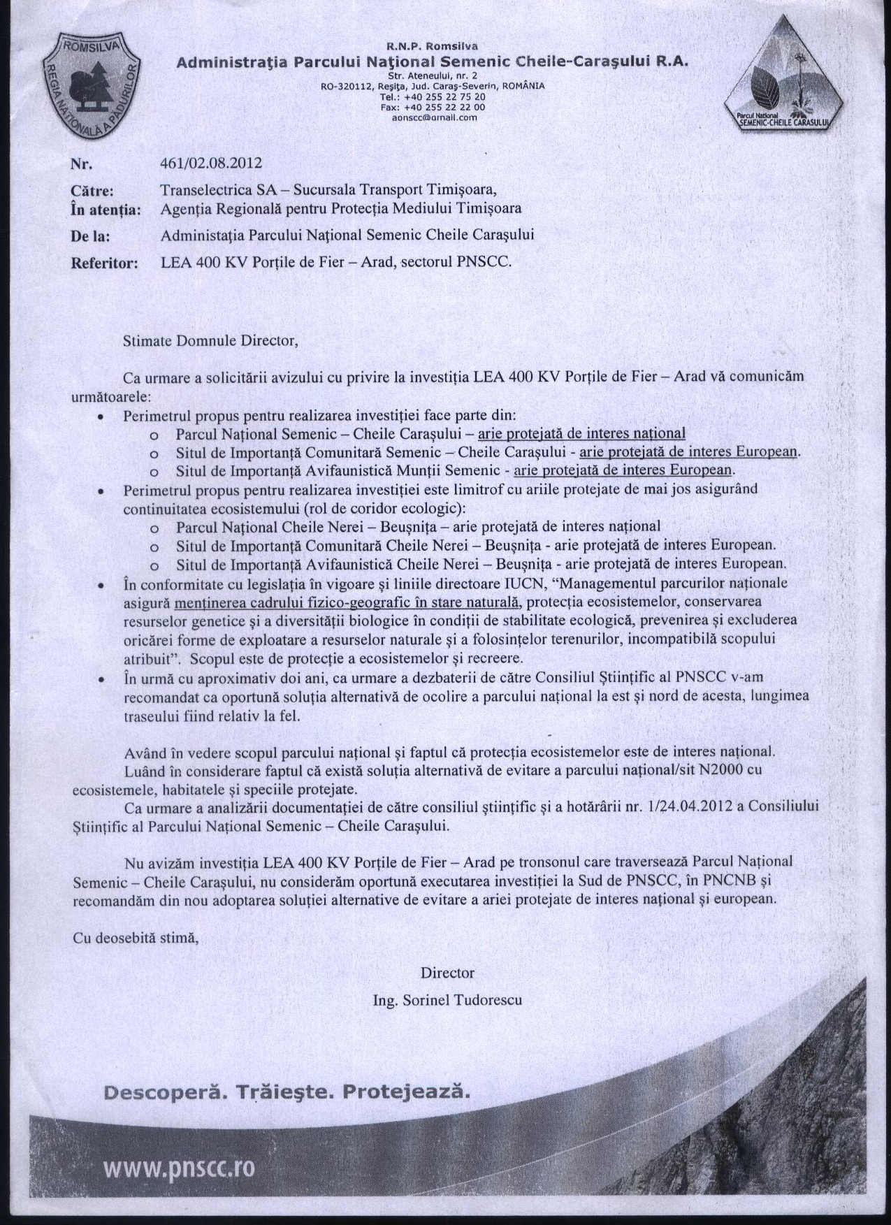 ,,Am studiat documentația care a fost depusă la administrația Parcului Național Semenic-Cheile Carașului. De fapt, proiectul a fost depus și la alte trei administrații de parcuri: Porțile de Fier, Domogled-Valea Cernei și Cheile Nerei-Beușnița și am considerat că este de interes național linia electrică de la Porțile de Fier la Pancevo și, în plus, mai există și Legea Ariilor Protejate care specifică faptul că, fiind de interes național, pot fi desfășurate anumite activități. Ceea ce este mai trist e că marea majoritate a membrilor Consiliului Științific nu au fost de acord ca acest proiect să se deruleze. În primul rând, mă refer la faptul că o suprafață a Parcului de circa 400-500 de metri este traversată de această linie electrică și este o zonă de conservare durabilă, nu una strictă, unde nu se pot desfășura activități. Cu toate acestea, chiar dacă membrii Consiliului Științific nu au fost de acord cu Transelectrica, deși e de interes național, eu am trecut peste această măsură, având în vedere că și celelalte avizări de la parcuri au venit. Noi am fost ultimul care e traversat, era normal ca eu să dau acest aviz pozitiv și nu văd cu ce ar putea să afecteze parcul, mai ales că nu e zonă strict protejată”, a declarat directorul Parcului Național Semenic, Sorinel Tudorescu.