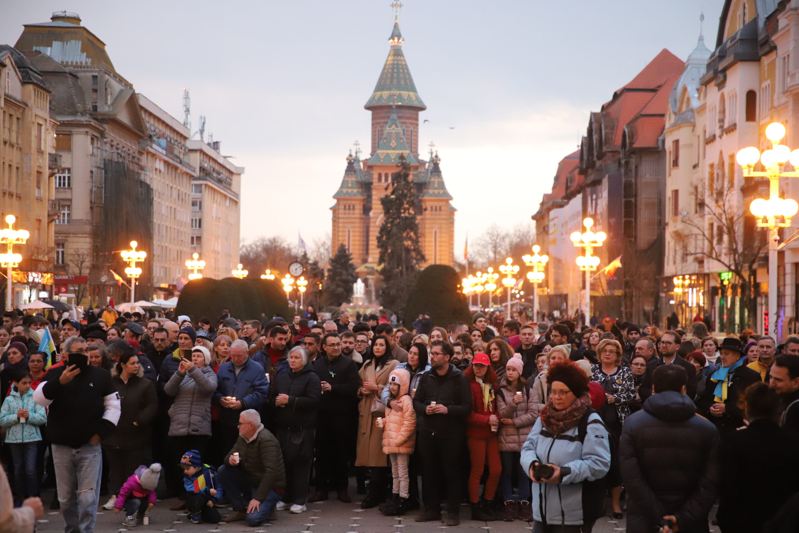Sute de persoane s-au strâns vineri seară în Piața Victoriei din Timișoara la un an de la declanșarea războiului împotriva Ucrainei. În semn de solidaritate, s-au aprins 365 de lumânări care simbolizează fiecare zi de luptă purtată în numele libertății.