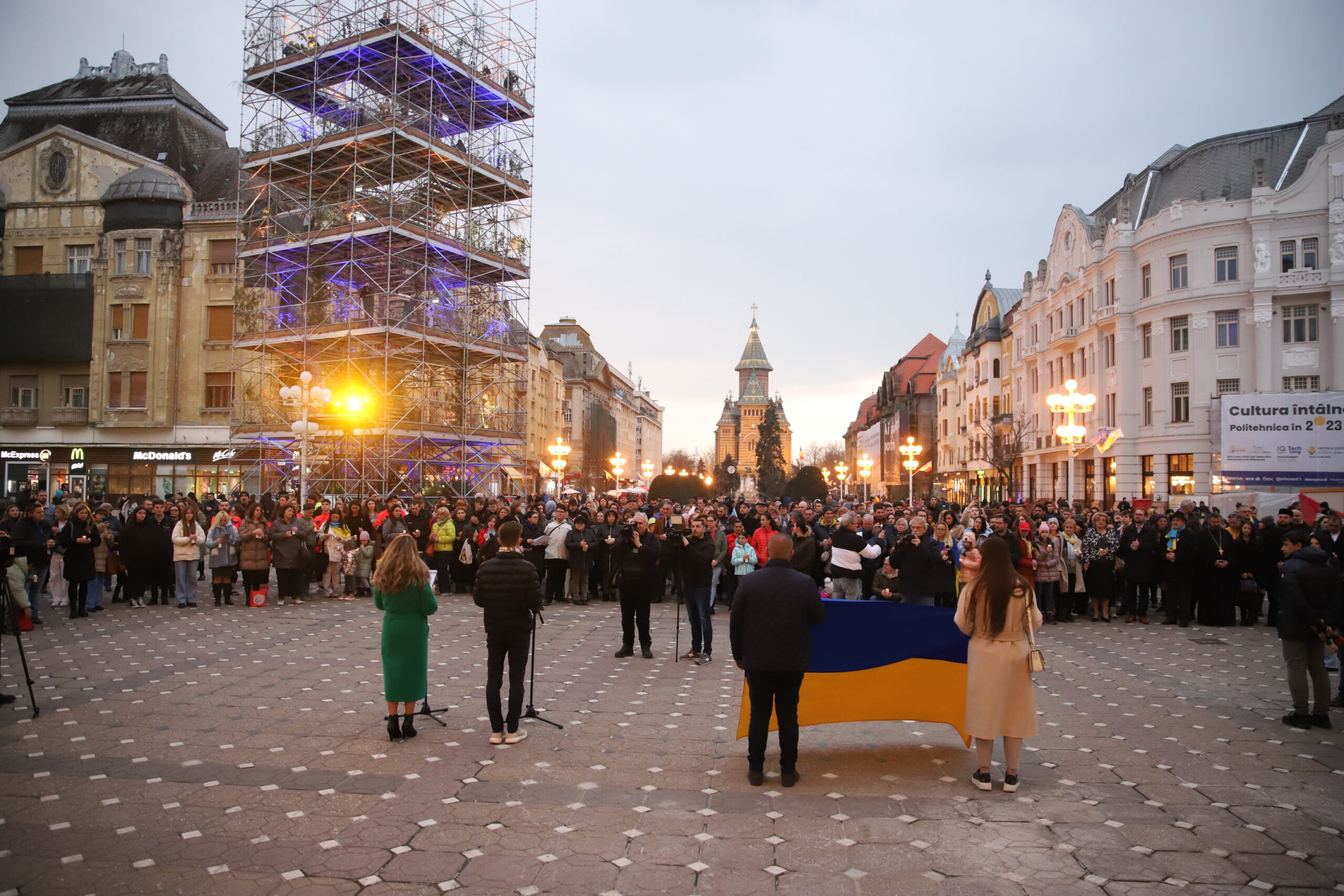 Au fost prezenți membri ai comunității ucrainene din Timișoara, organizații non-guvernamentale, culte religioase, instituții publice, partide politice, companii și societatea civilă. În cadrul evenimentului a fost păstrat un moment de reculegere în amintirea victimelor războiului și s-au rostit rugăciuni în ucraineană, română, maghiară, germană. La final, a fost citit „Apelul din Timișoara: Solidaritate cu Ucraina!” prin care întreaga comunitate timișoreană își exprimă susținerea față de valorile democrației, ale libertății și ale luptei pentru pace: