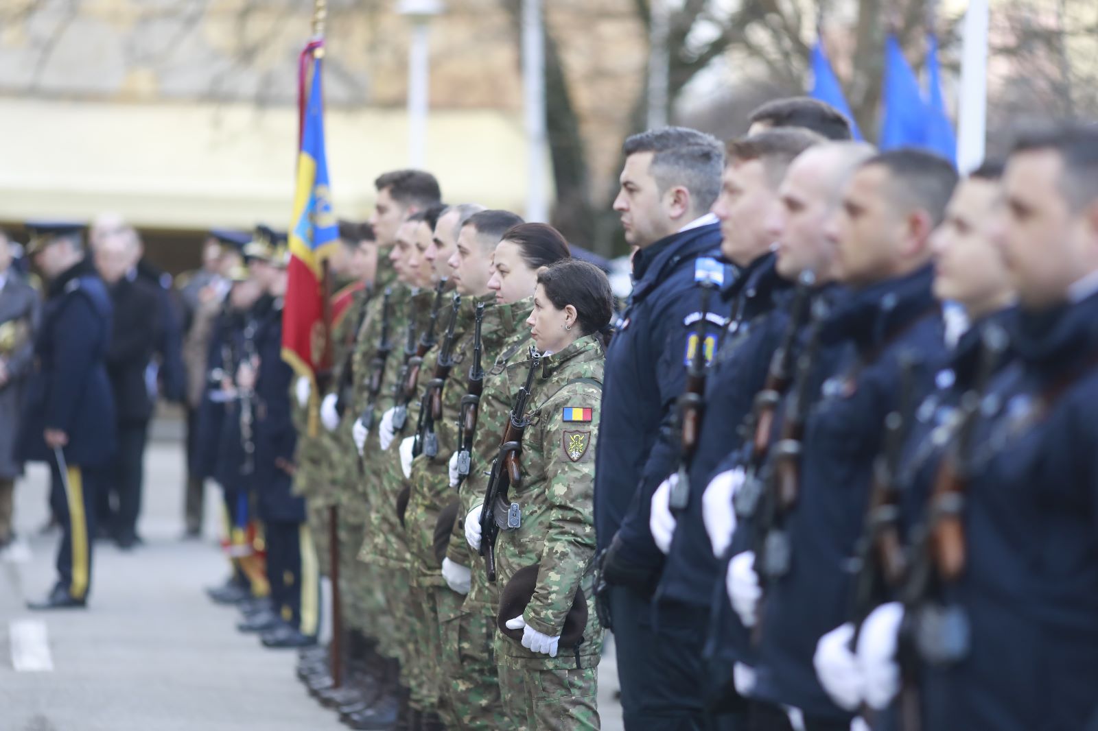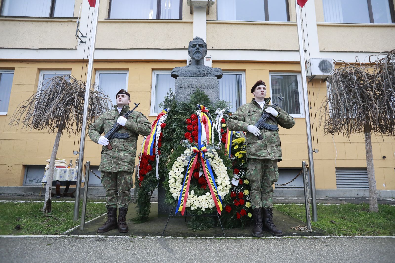 În fața monumentului domnitorului Alexandru Ioan Cuza din Timișoara a fost prezentat onorul, s-a salutat drapelul de luptă și s-a intonat imnul național.