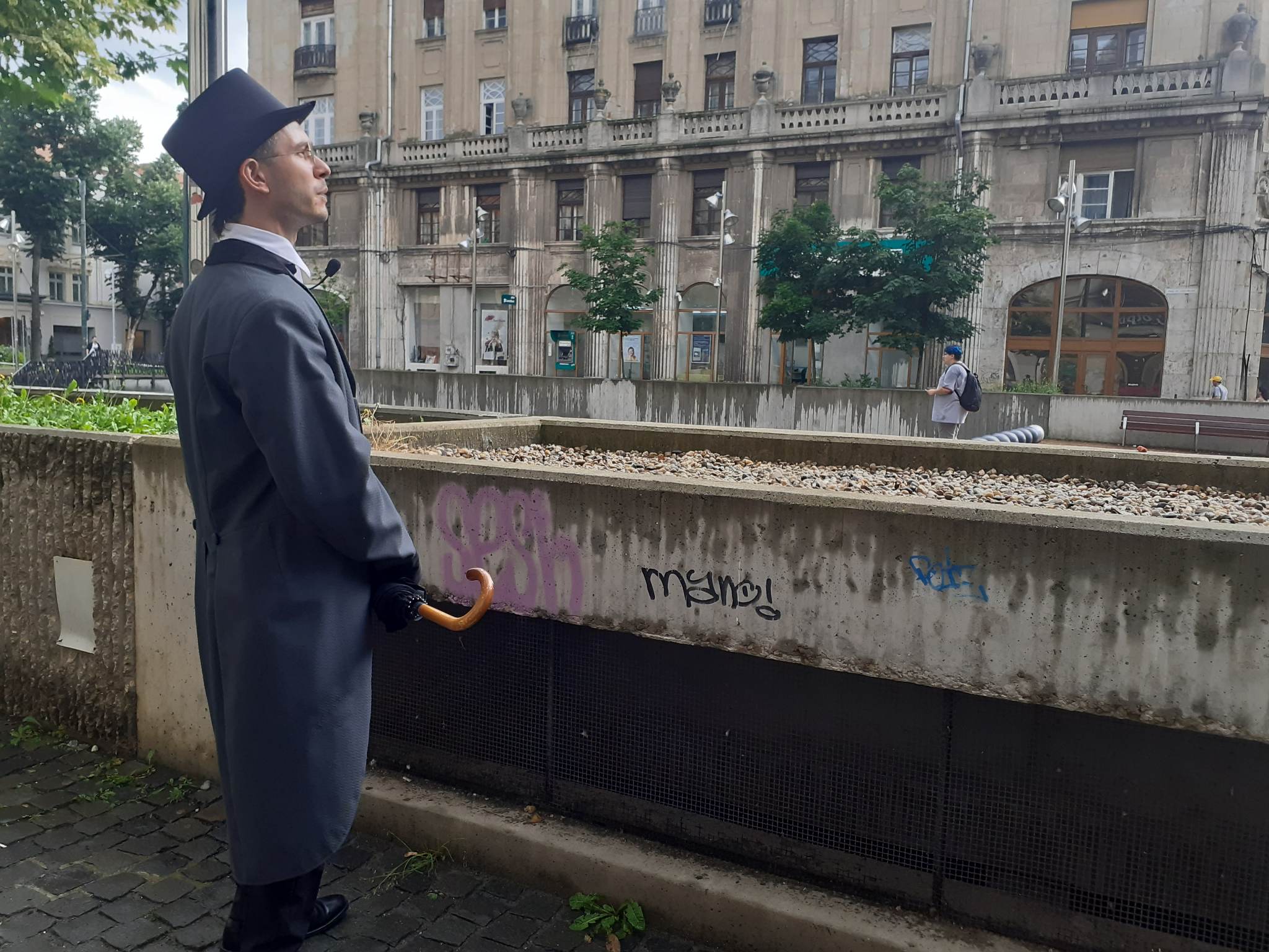 „Pornim din fața Palatului Bruck pentru că aici, la parter se află vechea farmacie Crucea de Aur, care funcționează neîntrerupt dinainte de anul 1900. Ne-am imaginat un personaj din anii 1920, un personaj tipic timișorean, care are origini în mai multe etnii: tata e român, mama e nemțoaică, a avut o bonă sârboaică, are o iubită unguroaică, are prieteni evrei, care este conectat cu lumea intelectuală și artistică din oraș, este prieten cu pictorul Oskar Szuhanek, este prieten cu Camil Petrescu – locuia la Timișoara în acea perioadă și ținea un cenaclu literar – și practic vom urmări o oră din după-amiaza acestui personaj, la Timișoara, care iese în oraș să se întâlnească cu prietenul lui, la o băutură, și înainte de asta merge să cumpere și ceva de la farmacie. Și îl vom urmări în drumul său, de la farmacie până la cafeneaua Lloyd. Îl cheamă Johann Nepomuk Demeter Iorgu Nicolin și locuiește în Piața Plevnei, în Casa cu păuni. Tatăl său este Romulus Nicolin, frizerul, are un atelier de frizerie în Cetate – personaj real.”, a povestit ghidul turistic Ludovic Satmari, de la Breasla Ghizilor.