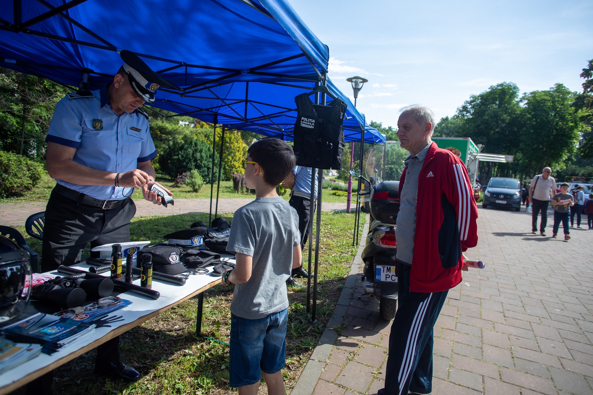 Distracția a început dis de dimineață, în Parcul Copiilor din Timișoara. Copiii au urmărit spectacolele micilor dansatori pe scenă, s-au întrecut la fotbal și au vizitat standurile polițiștilor locali unde au putut vedea mai multe echipamente din dotarea agenților.