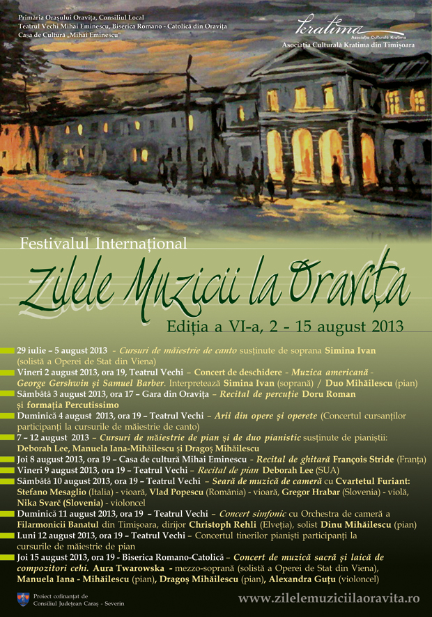 „În inima orașului Oravița a fost construit primul teatru din România, în anul 1817, după macheta Burgtheaterului din Viena. Denumit astăzi Teatrul Vechi, purtând și numele poetului Mihai Eminescu,el este o bijuterie arhitectonică. Dar un teatru nu este doar o clădire, ci şi un lăcaș al Artei. Dorim ca prin toate concertele din cadrul Festivalului Internațional Zilele Muzicii la Oravița să dăinuiască un teatru viu, care emană lumină spirituală”, a precizat Manuela Iana‐Mihăilescu, directorul artistic al festivalului.