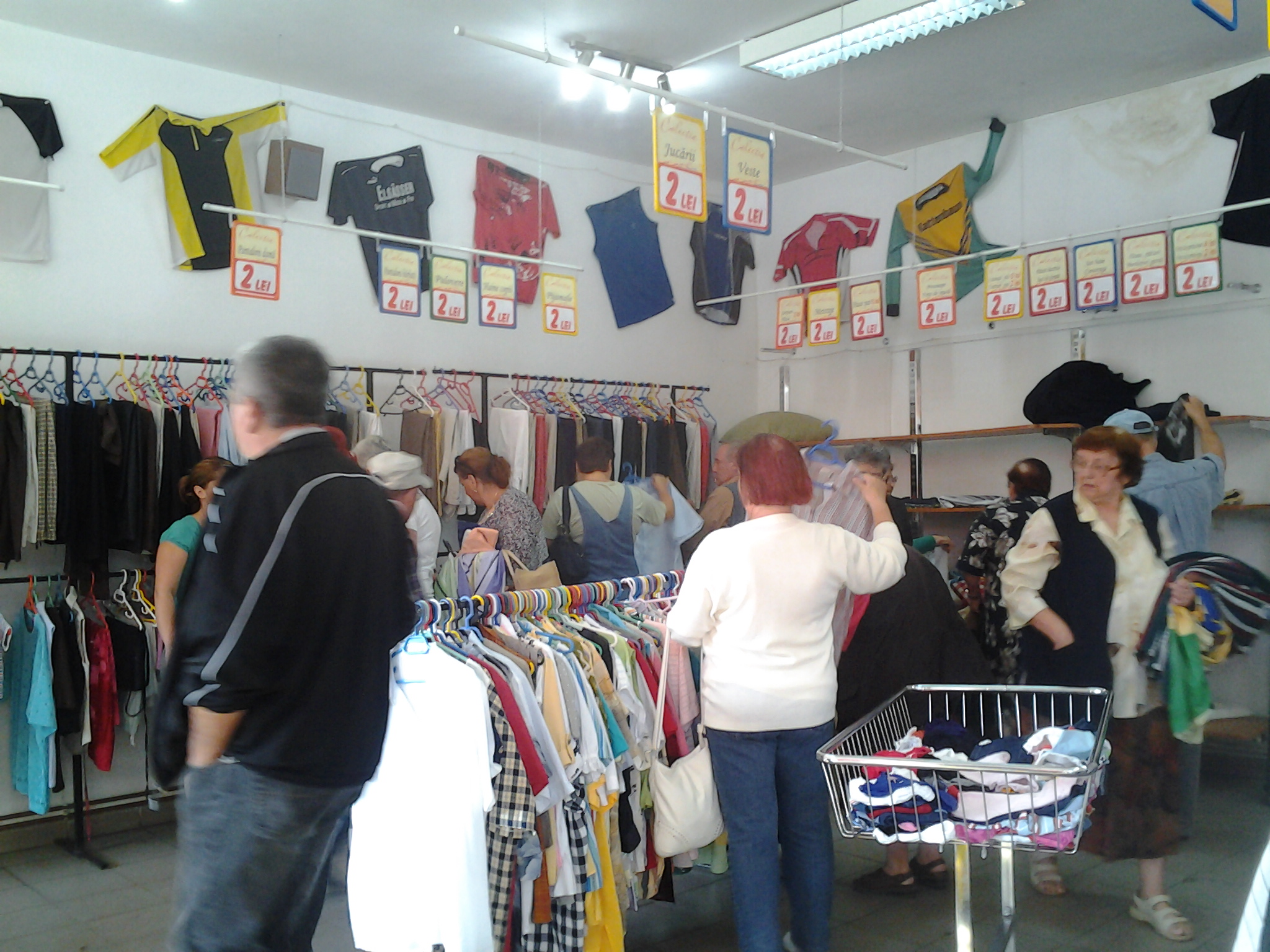 ,,Avem din ce în ce mai mulți clienți, nu prea rămânem cu haine pe umerașe la sfârșit de săptămână. Este o adevărată nebunie în zilele când orice produs este doi lei. Se adună o grămadă de oameni la coadă. Pentru vânzări este foarte bine că se îngrămădesc să cumpere, dar prea se împing și se ceartă, aproape că nu-ți vine să deschizi magazinul când vezi câtă lume așteaptă afară”, a explicat Maria Bochiș, vânzătoare la unul dintre buticurile second-hand reșițene.