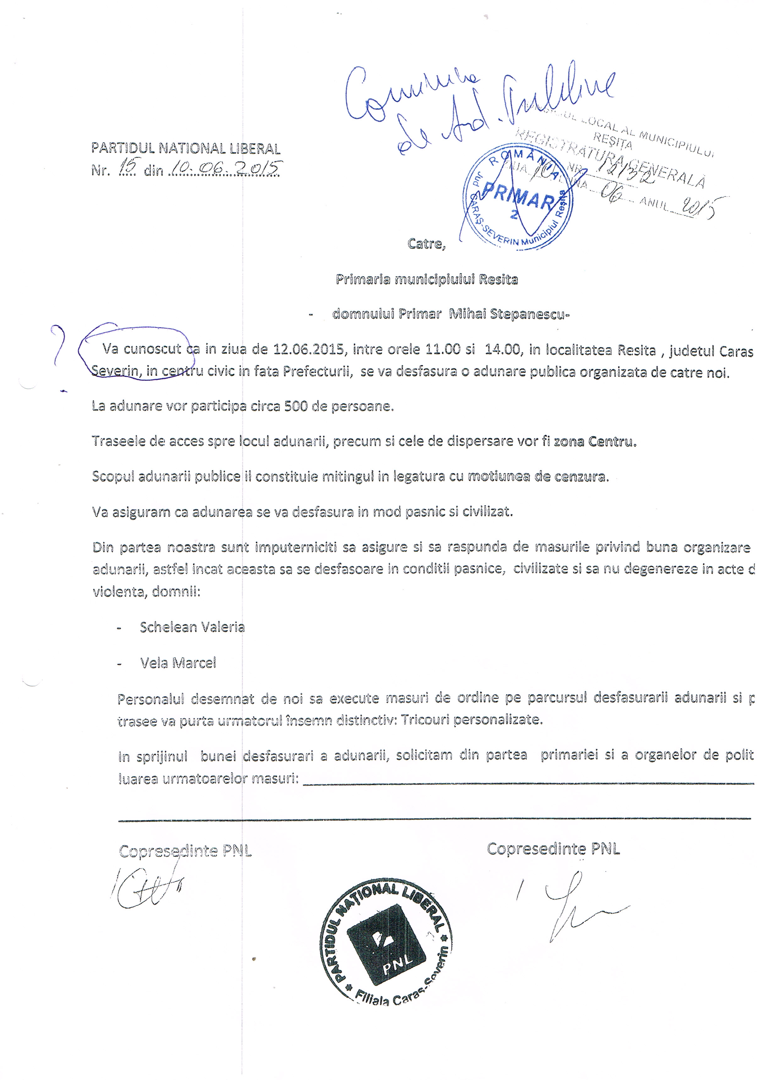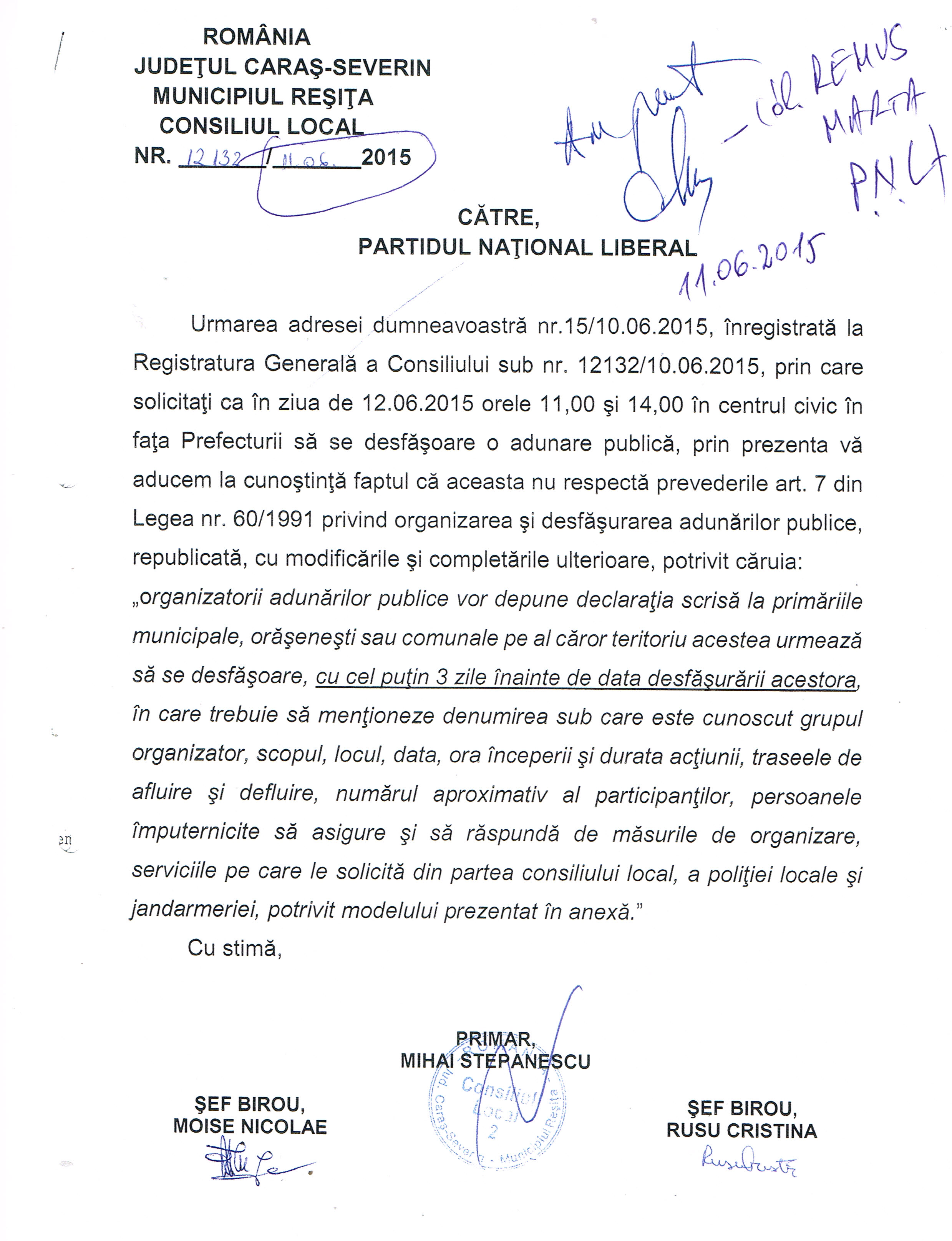 Asta după ce, așa cum susțin liberalii, Primăria Reșița ar fi refuzat să dea aviz pentru organizarea unui miting în centrul civic.