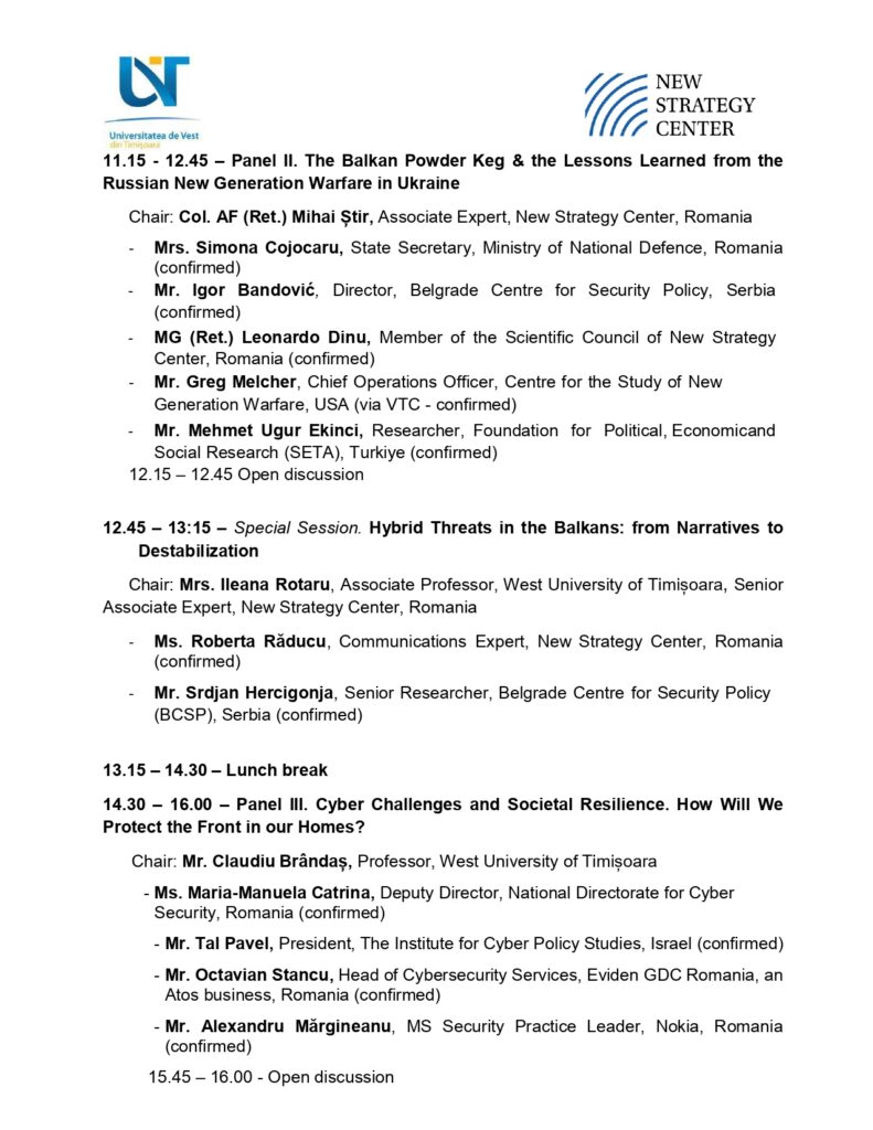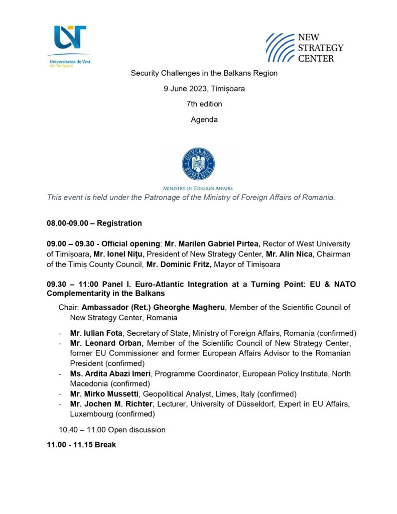 Conferința internațională va avea loc la Timișoara, în 9 iunie, la Complex Senator (Calea Lugojului nr. 7) și este organizată în cadrul parteneriatului existent între Universitatea de Vest din Timișoara și New Strategy Center și sub patronajul Ministerului Afacerilor Externe.