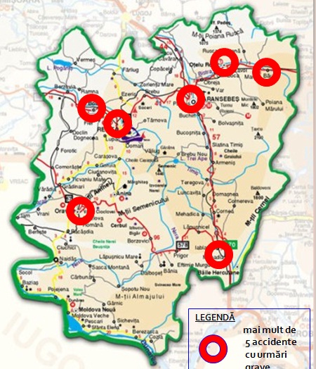 Așadar, cele șapte zone cărora șoferii ar trebui să le acorde o atenție deosebită sunt în jurul orașului Reșița, pe DN58 B, drumul ce leagă Reșița de Bocșa, în jurul localității Oravița, pe drumul european E70, în special între Caransebeș și Buchin și aproape de Băile Herculane, mai exact la Mehadia, poreclit și „drumul morții”. De altfel, o altă zonă neagră se află în jurul localității Oțelu Roșu, fiind Drumul Național 68, care leagă județele Caraș-Severin şi Hunedoara. Ultima zonă recunoscută ca fiind periculoasă, cu mai mult de cinci evenimente rutiere grave, este pe același drum național amintit anterior, la granița cu județul Hunedoara, pe raza comunei Băuțar.