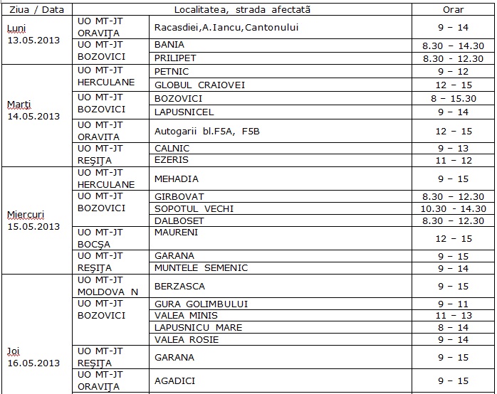 Compania Enel anunță că în zilele următoare pe raza județului Caraș-Severin vor exista întreruperi de energie electrică planificate pentru revizii, reparații și modernizări în rețeaua de distribuție.